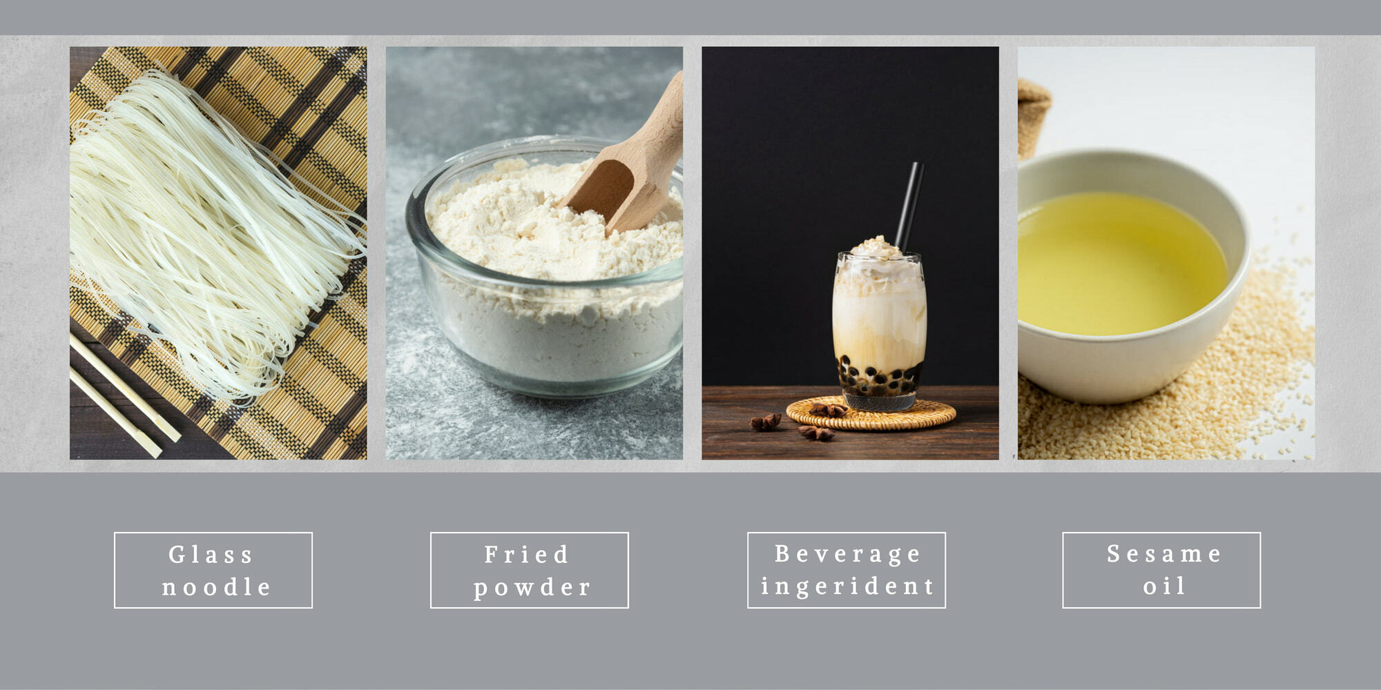 We are able to offer an extensive range of packaged food products and OEM/ODM, including glass noodle, rice noodle, fried powder, sesame oil, sugar, baverage ingredients. For more details or quotations, please