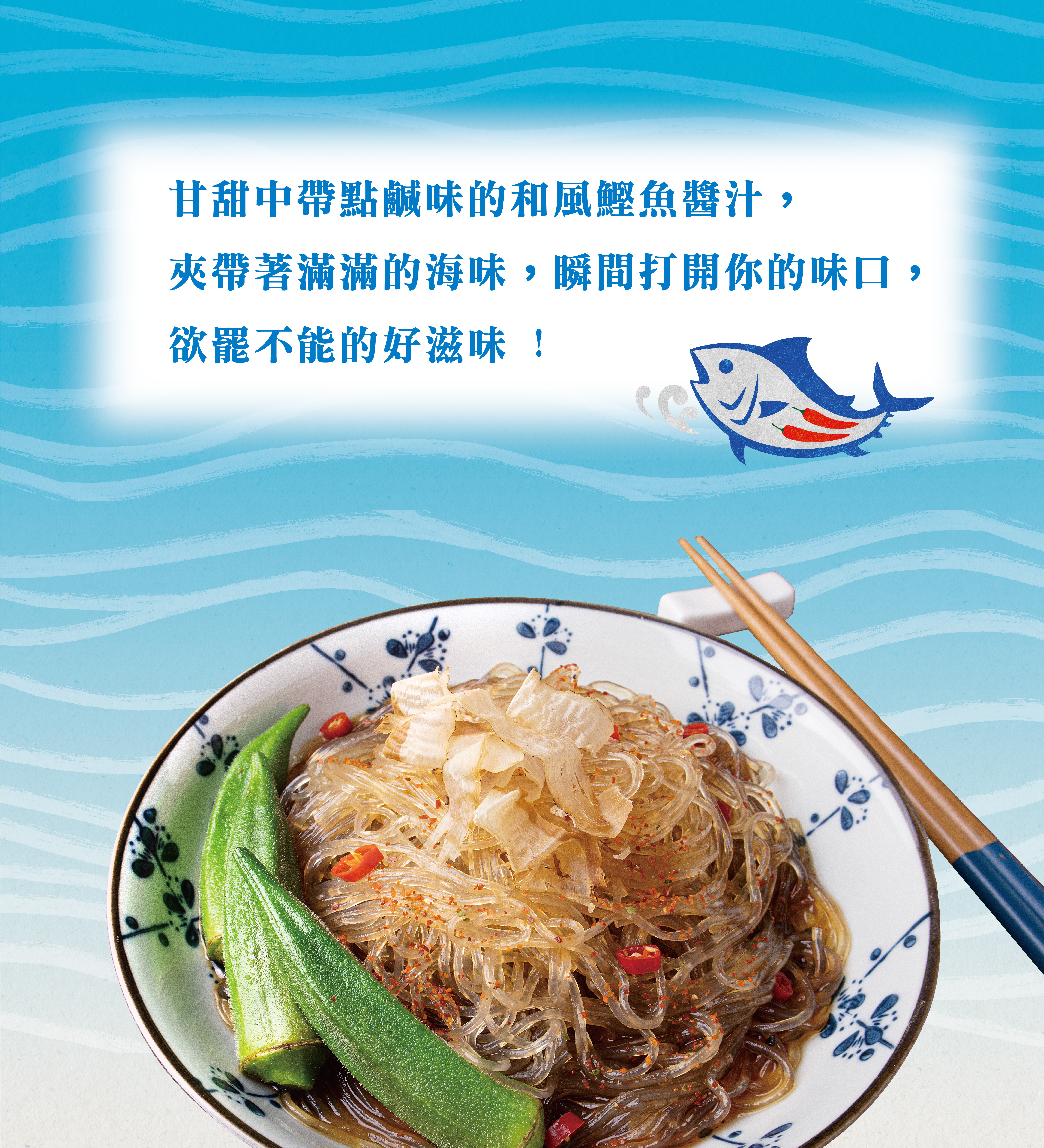 ●甘甜中略帶微鹹的和風鰹魚醬汁,夾帶著滿滿的海味,瞬間打開你的胃口,欲罷不能