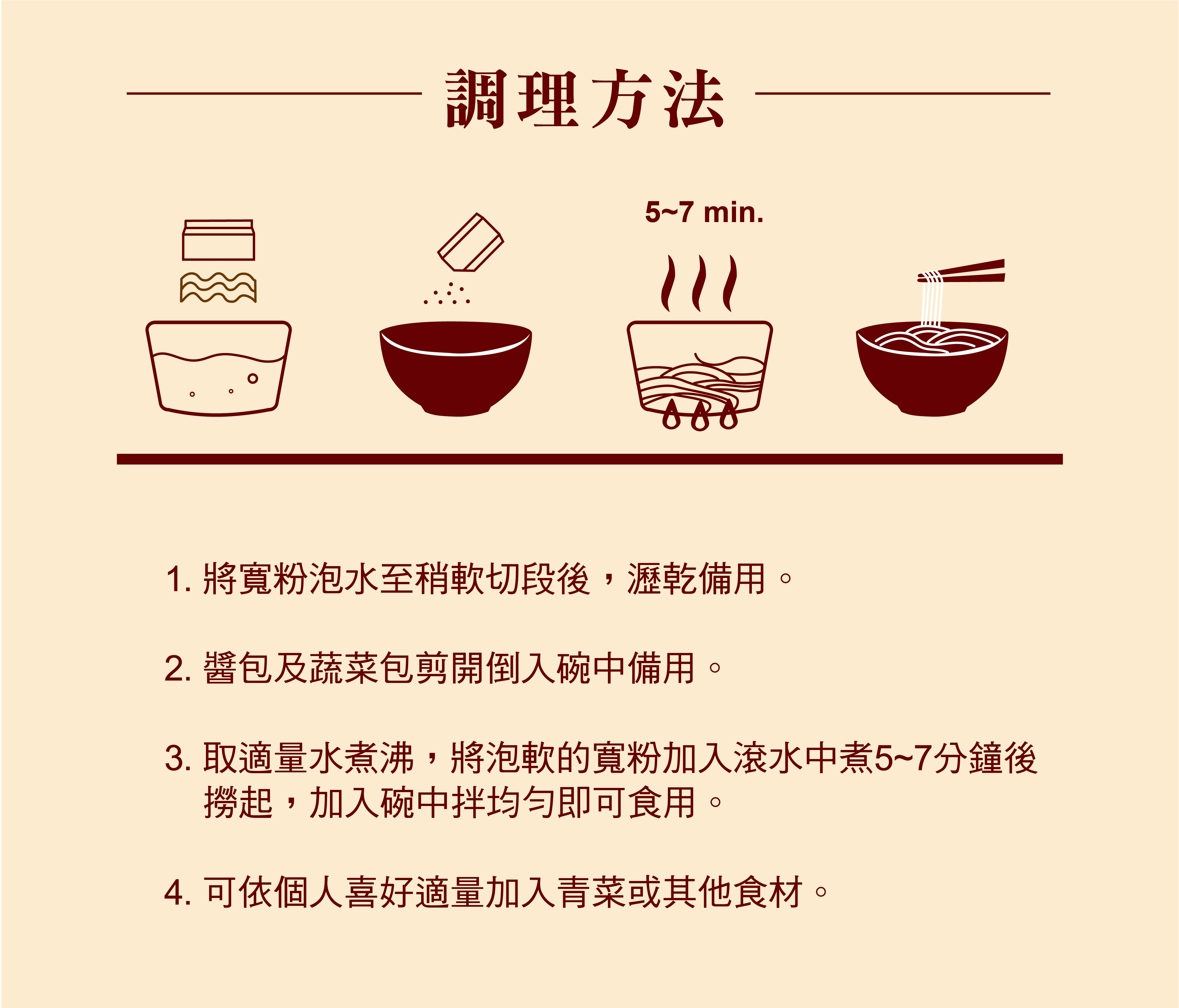 ●調理方便,寬粉泡軟後用滾水煮5-7分鐘,撈起後與醬包、蔬菜包一起拌均勻即可食用